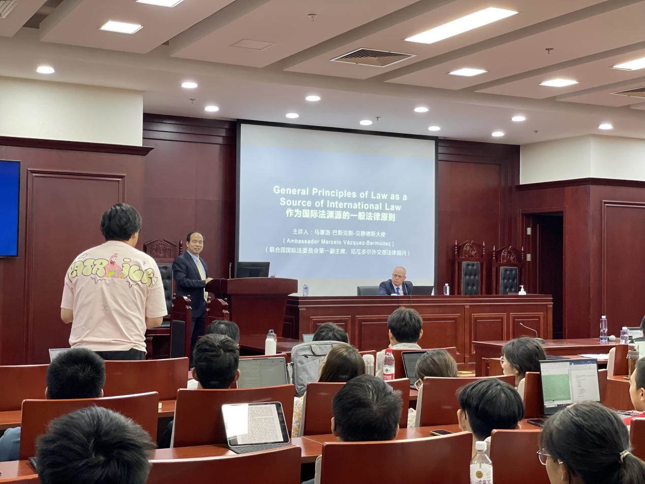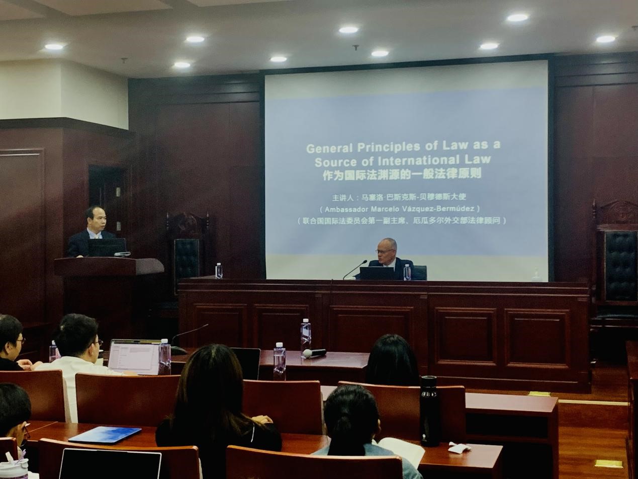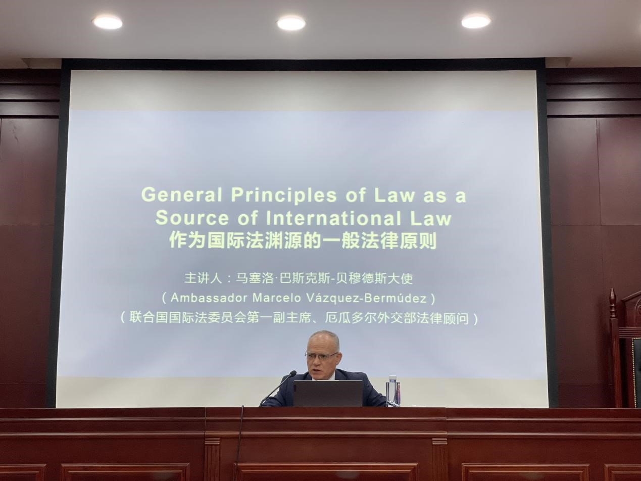 2023年9月27日下午,联合国国际法委员会第一副主席马塞洛·巴斯克斯-贝穆德斯大使应邀为我院师生进行了“作为国际法渊源的一般法律原则(General Principles of Law as a Source of International Law)”的讲座。国际法系易显河教授主持讲座。