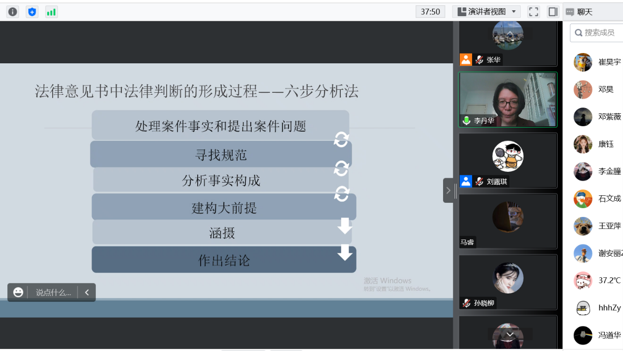 2022年11月4日下午,国际法系举办了“法律文书写作——如何写好案件分析类法律意见书”线上讲座,主讲人为北京市德恒律师事务所李丹华律师,讲座由国际法系教学副主任张华副教授主持,2021级法律(法学)硕士研究生全体参加。
