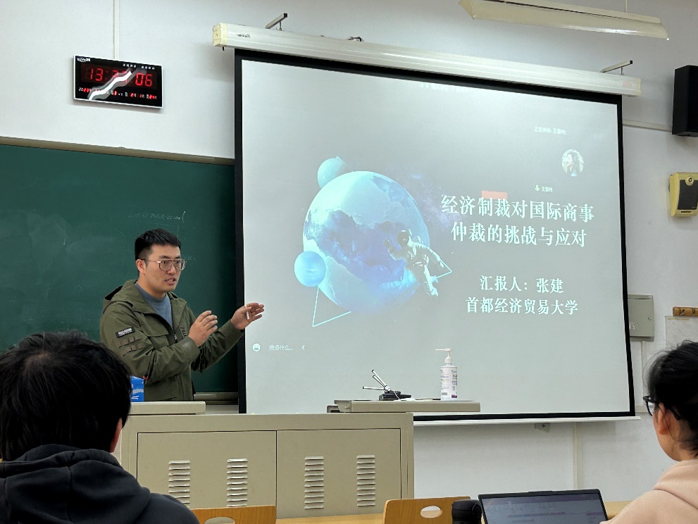 首先,张建副教授向同学们介绍了经济制裁这一研究主题。经济制裁现已成为国内外国际法学术研究的“热词”,是国际公法、国际经济法、国际私法的共同议题。在实践中,经济制裁的使用日渐频繁,其对国际商事仲裁造成了多重冲击,因此研究涉及经济制裁的国际商事仲裁具有迫切性。张副教授进一步介绍了国际私法视角下与仲裁相关的经济制裁所面临的问题,分析了仲裁庭的管辖权、经济制裁的性质,以及裁决的跨国承认及执行等问题。而后,张副教授从理论到实践,逐层深入,带领大家体会商事仲裁中应对经济制裁的分析思路。在讲座的最后,同学们就本次讲座内容与张建副教授展开积极互动,讨论了涉及经济制裁的商事仲裁中仲裁员的回避等问题。
