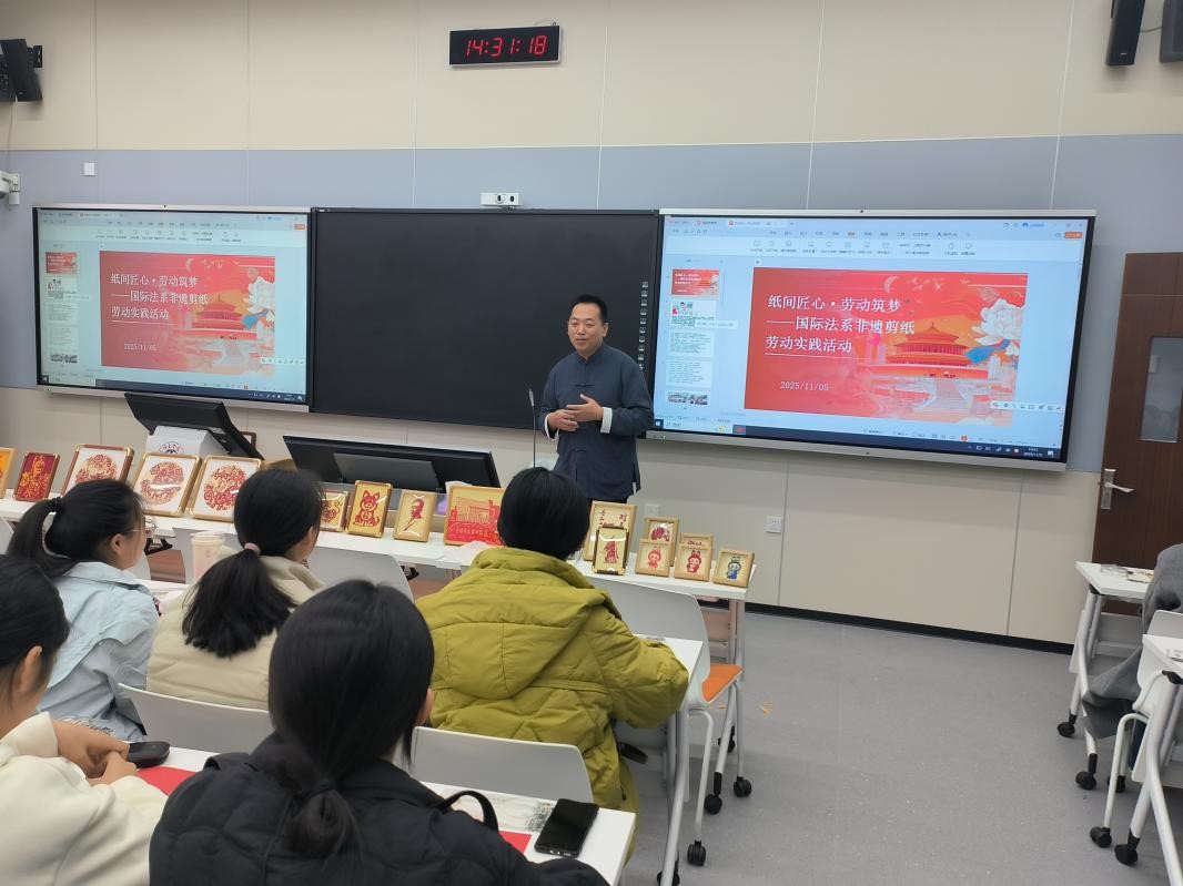 为传承中华优秀传统文化,深化劳动教育实践育人成效,国际法系于11月5日组织开展了“纸间匠心·劳动筑梦”非遗剪纸劳动实践活动。本次活动以国家级非物质文化遗产剪纸艺术为载体,通过“文化传承+劳动实践”的创新模式,引导青年学子在方寸纸张之间体悟劳动之美、厚植文化自信。活动由辅导员郭欣彤主持,国际法系全体大一学生及部分大二、大三学生参与。
