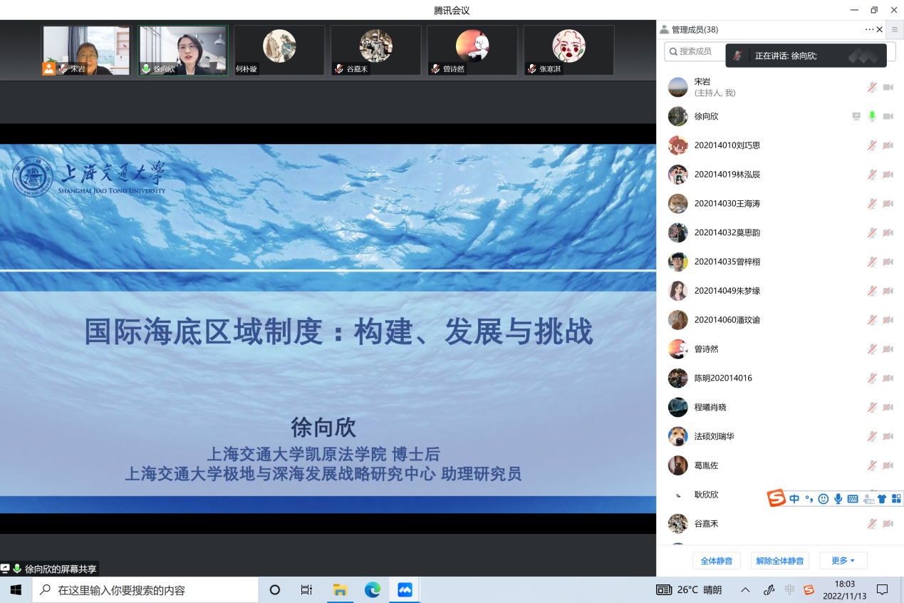 2022年11月13日晚,国际法系在线上举办了“国际海底区域制度:构建、发展与挑战”讲座。本次讲座由上海交通大学极地与深海发展战略研究中心助理研究员徐向欣老师主讲,国际法系宋岩老师主持,卓越涉外法学实验班全体同学、部分研究生同学参加。