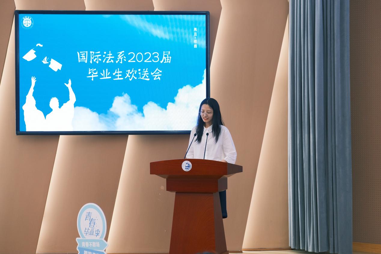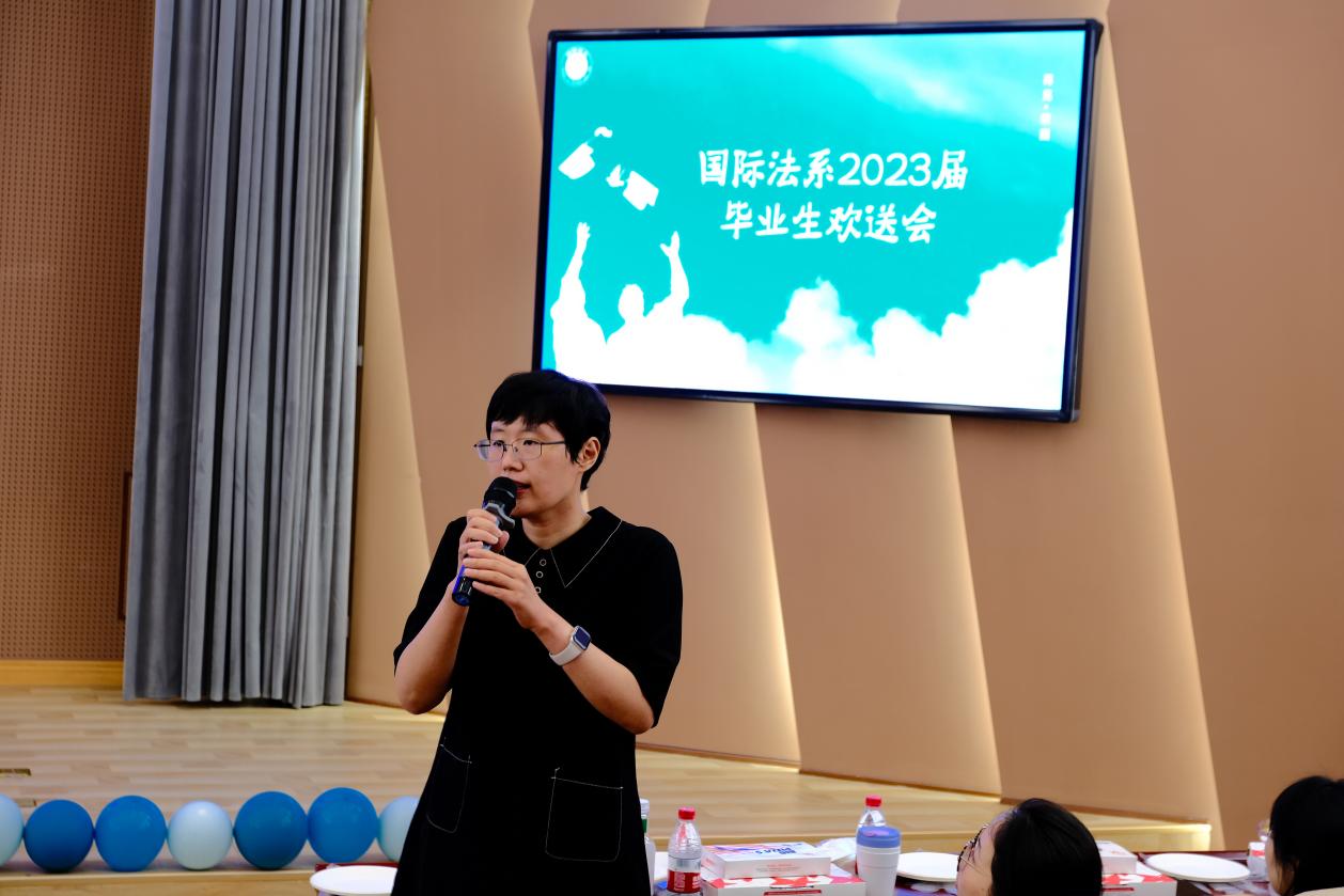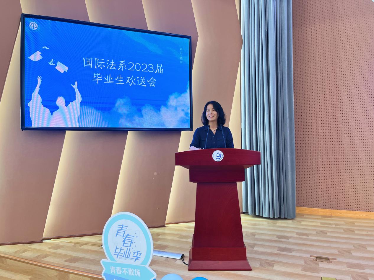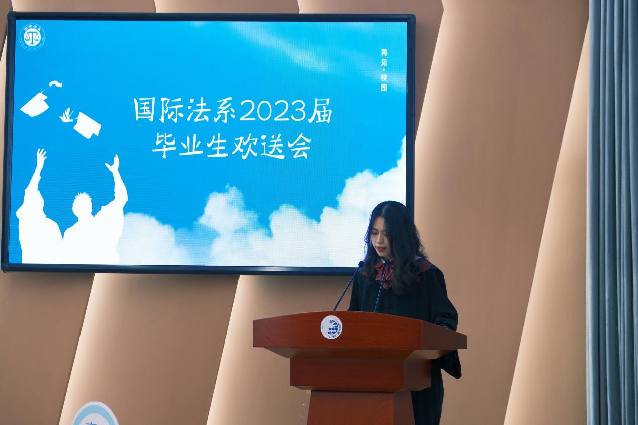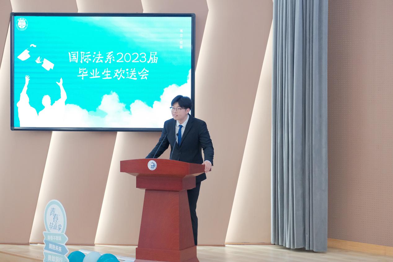 教学副主任张华老师致辞。张老师代表国际法系全体老师祝贺2023届毕业生圆满完成大学生活,希望同学们在今后的学习和工作中,严守纪律,守正创新。在顺境中,坚守法律人的底线,在逆境中,勇于面对生活的挑战,祝福同学们活出心花怒放的人生。