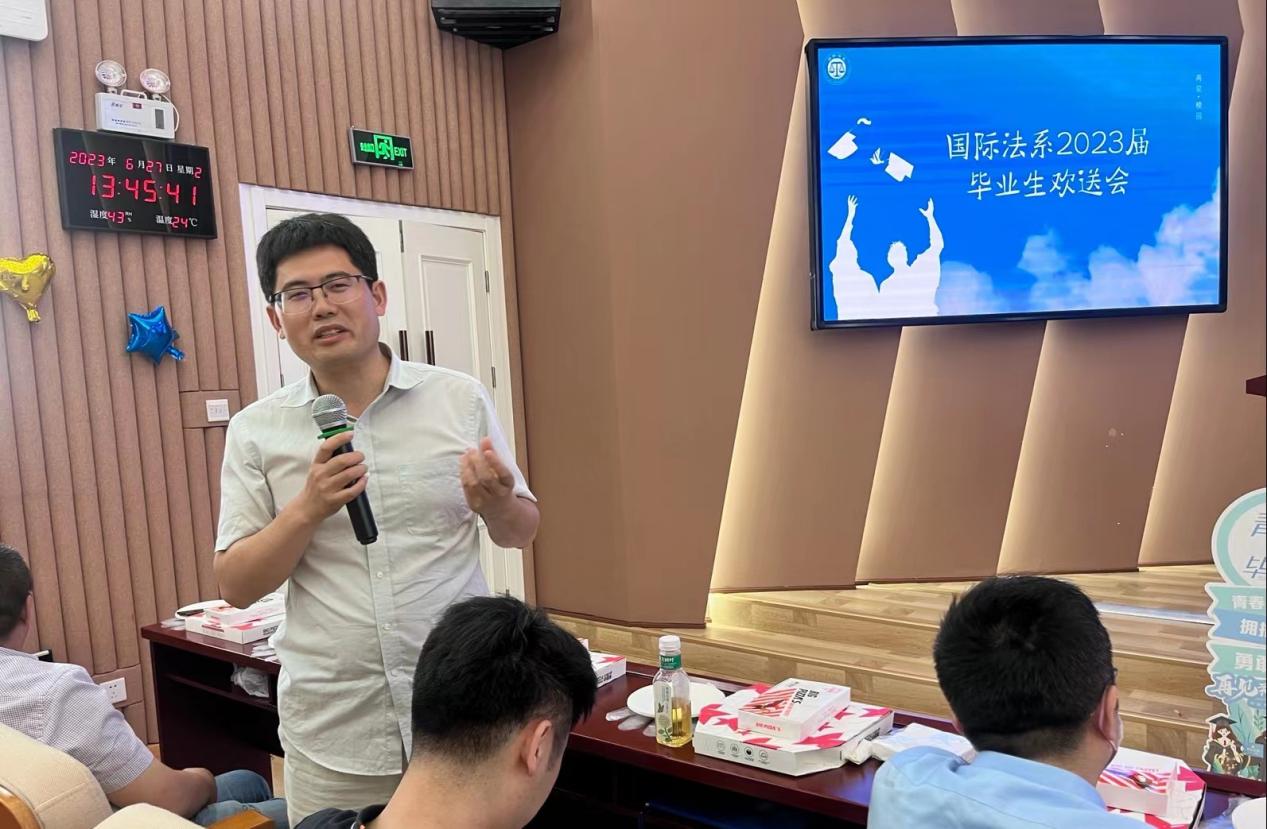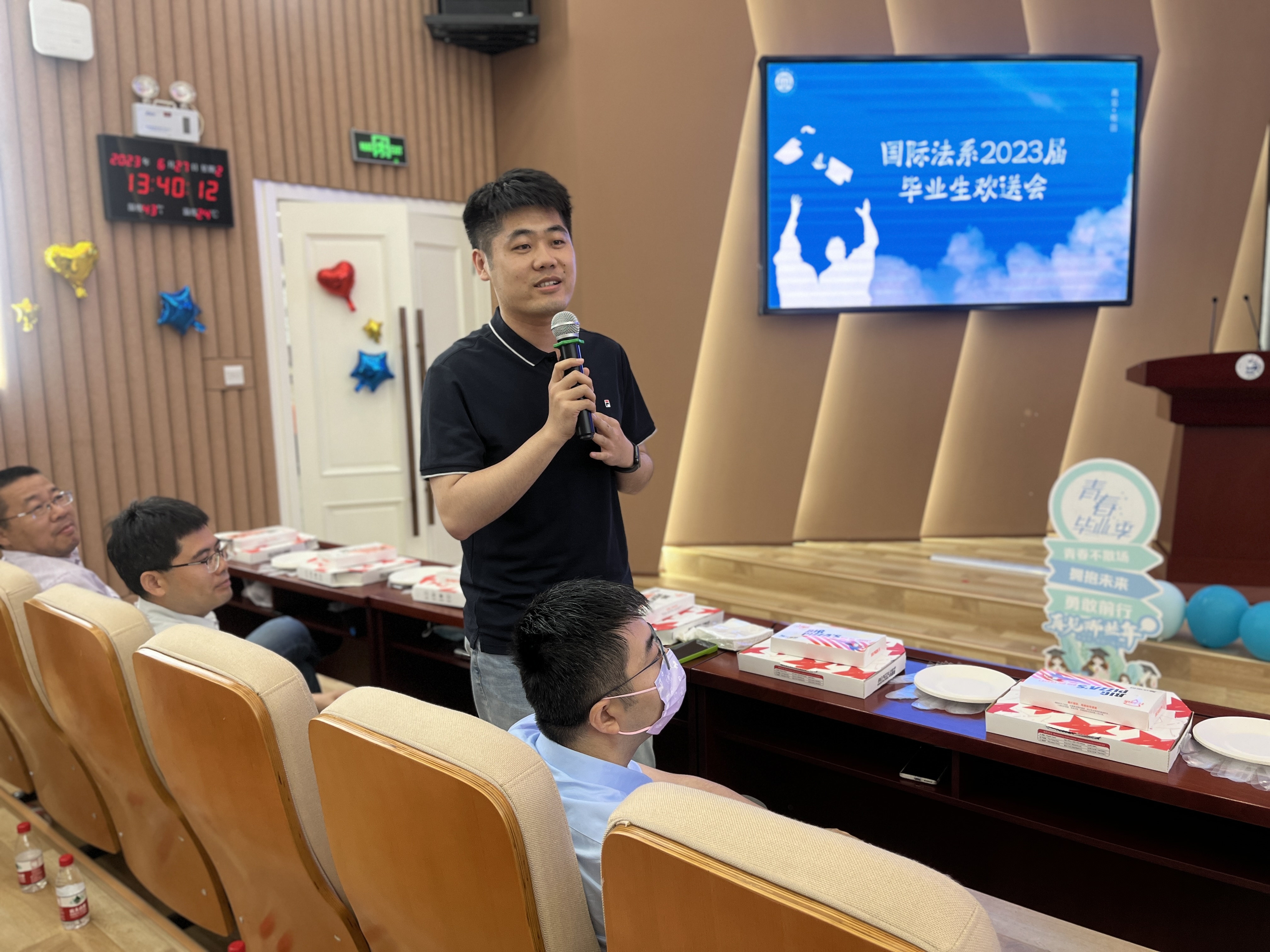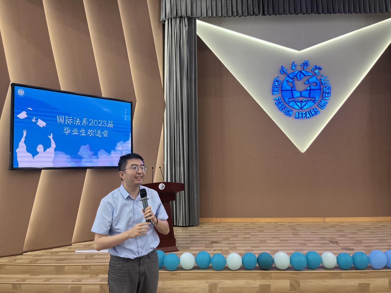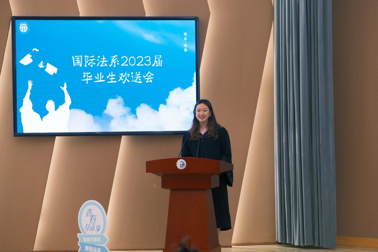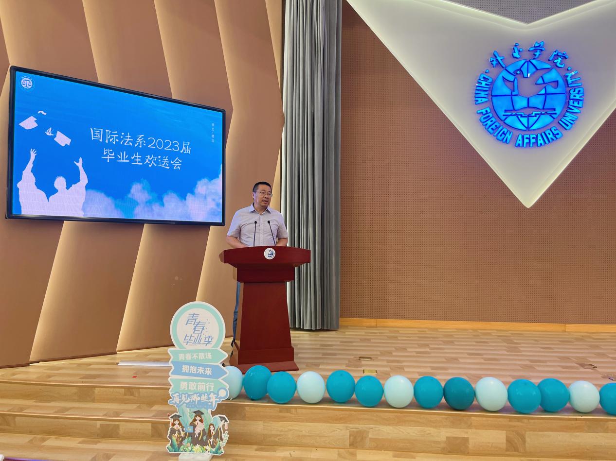 教学副主任张华老师致辞。张老师代表国际法系全体老师祝贺2023届毕业生圆满完成大学生活,希望同学们在今后的学习和工作中,严守纪律,守正创新。在顺境中,坚守法律人的底线,在逆境中,勇于面对生活的挑战,祝福同学们活出心花怒放的人生。