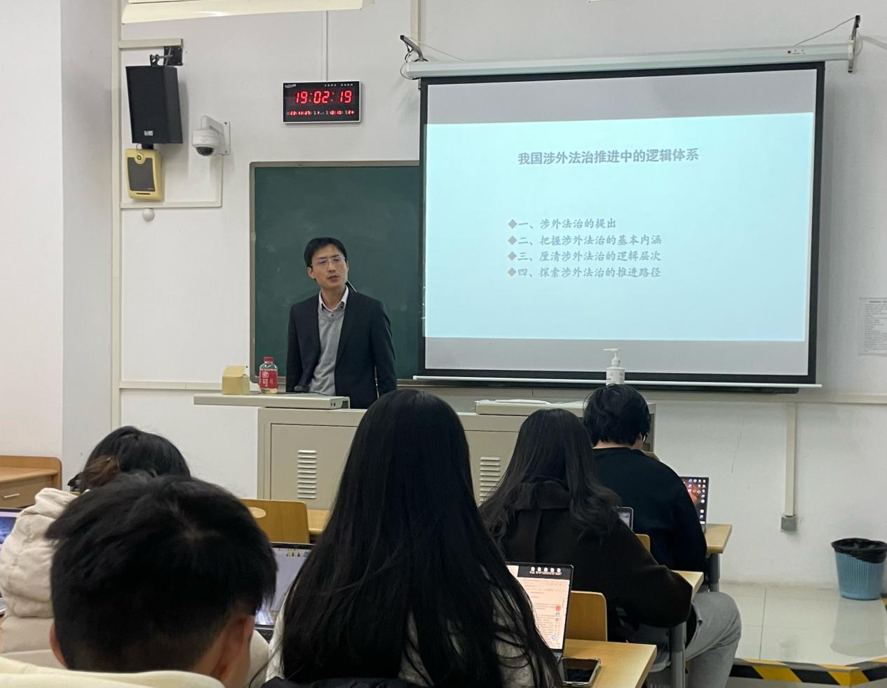 张教授首先对“涉外法治”概念的提出背景和过程进行了介绍;接着阐释了涉外法治的内涵;而后重点着眼于厘清我国涉外法治的逻辑层次;最后从国际和国内的双向视角探索了涉外法治的推进路径。最后,张教授对同学们提出的问题进行了解答。