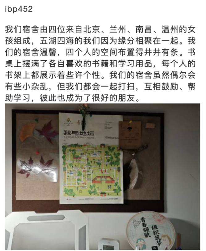 为加强国际法系宿舍文化建设,打造和谐、温馨、宜居的宿舍氛围,丰富宿舍生活体验,外交学院国际法系于2024年11月举办了“‘宿’说青春,‘寓’见幸福”宿舍文化节。本次活动旨在展现国际法系学子丰富多彩的宿舍生活,增进同学情谊,传递青春正能量,培育和谐温馨、积极向上、活力四射的校园文化。