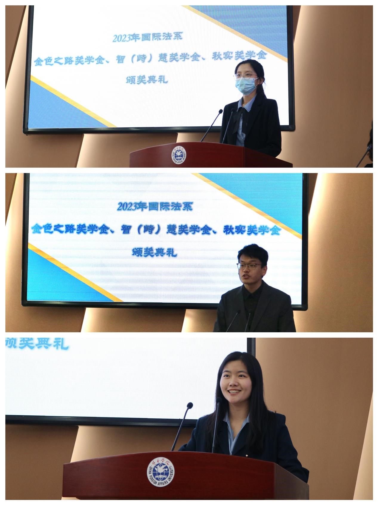 崔砾元、木新涛同学、王梓欢同学作为获奖学生代表发言。三位同学对奖学金设立者表示衷心感谢,并将带着校友们的期许,肩负起使命和责任,不懈奋斗。