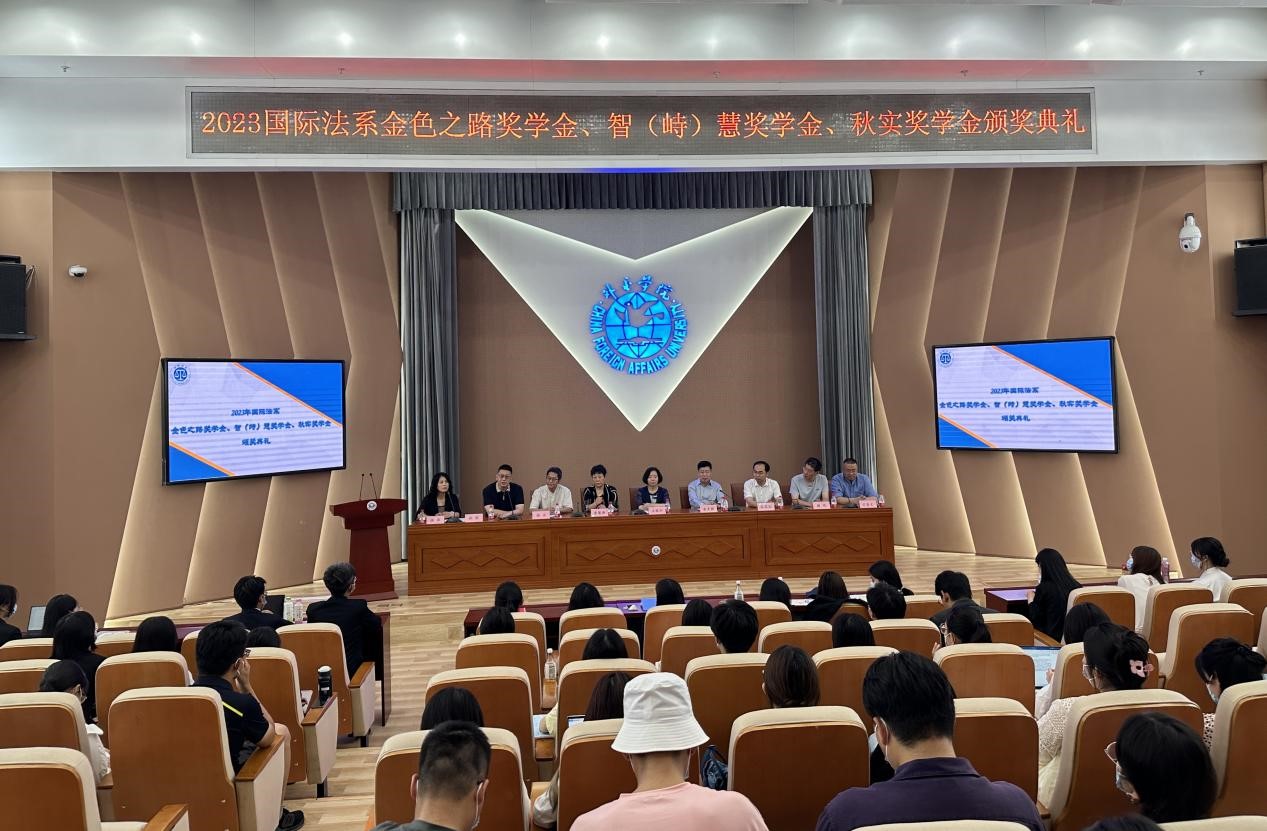 2023年6月4日下午,2023年国际法系金色之路奖学金、智(峙)慧奖学金、秋实奖学金颁奖典礼在沙河校区图书馆报告厅成功举办。外交学院许军珂副院长、“金色之路奖学金”设立者金克胜老师、“智(峙)慧奖学金”设立者袁慧燕老师、“秋实奖学金”设立者代表张汶、杜朋、张国勋、殷悦四位校友、国际法系教学副主任张华老师及行政副主任迟喜文老师出席了本次颁奖典礼。本次活动由张华老师主持,沙河校区超过百名同学积极参加。