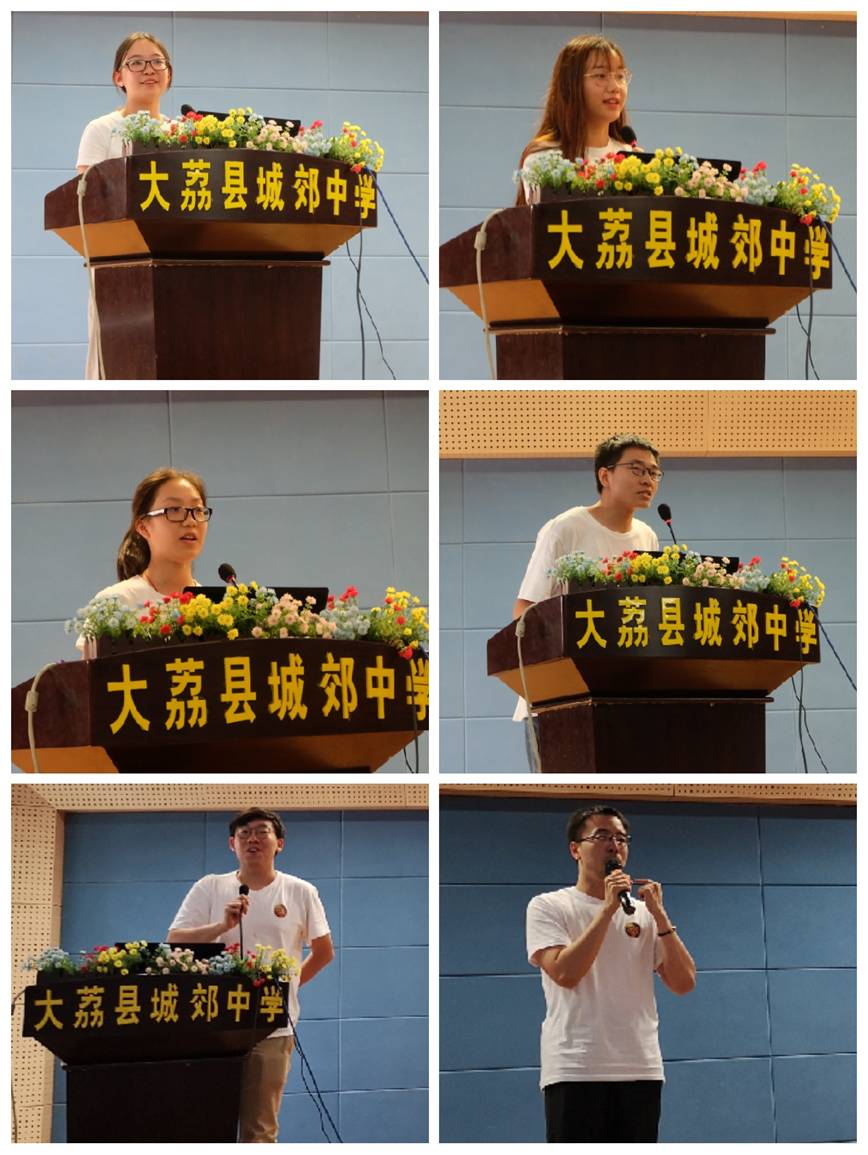 下午3时许,实践团师生来到大荔县城郊中学,与300多名即将升入高三的优秀学生进行了主题为“放飞青春梦想,书写人生华章”的交流活动。谢梦老师先对我校的情况进行了详细生动的介绍,之后实践团的同学们一一分享了自己的高中学习经验以及大学生活经历。互动环节,气氛热烈,实践团师生解答了台下同学们提出的关于学习英语的经验、保持学习热情的方法、高三心态的调整等问题,激励大荔县中学学子努力学习,以积极乐观的态度备战高考,以国家和民族的命运为己任。最后,国际法系潘皞宇副教授总结发言,分享了自己的求学成长经历,激励同学们要懂得坚持,勇于创造和拼搏,赢得了同学们的热烈掌声。