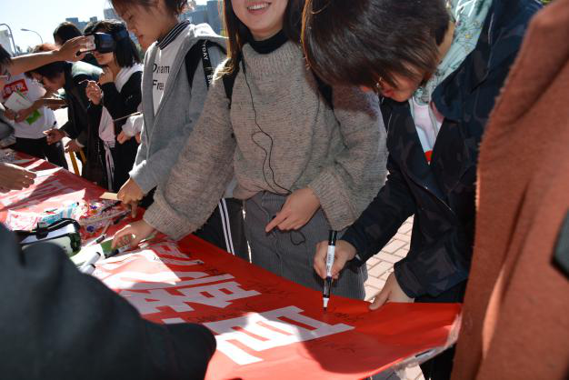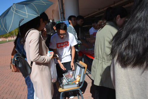 在前期做了充分的活动宣传后,10月23日中午,禁毒条幅签名活动和禁毒文案书写活动正式在学生宿舍楼下开展。活动不仅准备了传统常见的签字条幅、海报、展板、宣传手册,还有从北京市禁毒教育基地借来的仿真毒品和VR眼镜,充分吸引了来往师生的兴趣。同学们了解、学习有关禁毒的知识,在活动条幅上签下名字,做出远离毒品的承诺,表明禁毒的决心。在法援成员们的指引示范下,同学们驻足观看仿真毒品,戴上VR眼镜亲临犯罪现场、感受吸食毒品的强烈震荡,受到了直观的视觉冲击和心灵震撼,对毒品产生彻底的抵触、抗拒,也对警惕毒品侵害的情况有了更全面、深刻的了解,禁毒活动宣传效果显著。