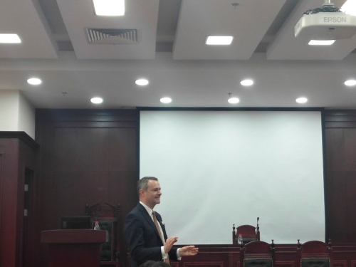 应国际法系教师季华博士邀请,4月17日下午,亚洲基础设施投资银行首席法律顾问Peter Quayle教授来我校沙河校区模拟法庭做专题讲座,讲座的主题为“亚洲基础设施投资银行的国际法基础”。本次讲座由季华博士主持,宋岩博士、我系2016级、2017级实验班同学以及硕士生60余人参加了此次讲座。