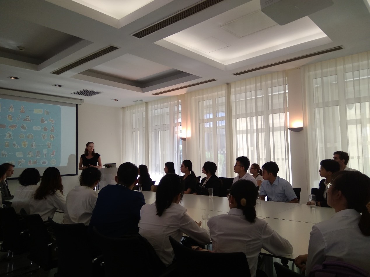 当天下午,同学们在严文君、李梦昕老师带领下前往荷兰王国驻华大使馆参观。同学们认真聆听了使馆外交人员的介绍,用流利的英语与使馆人员进行交流,问答之间展现了来自全国各地选拔出来的国际法优秀人才的高素养。