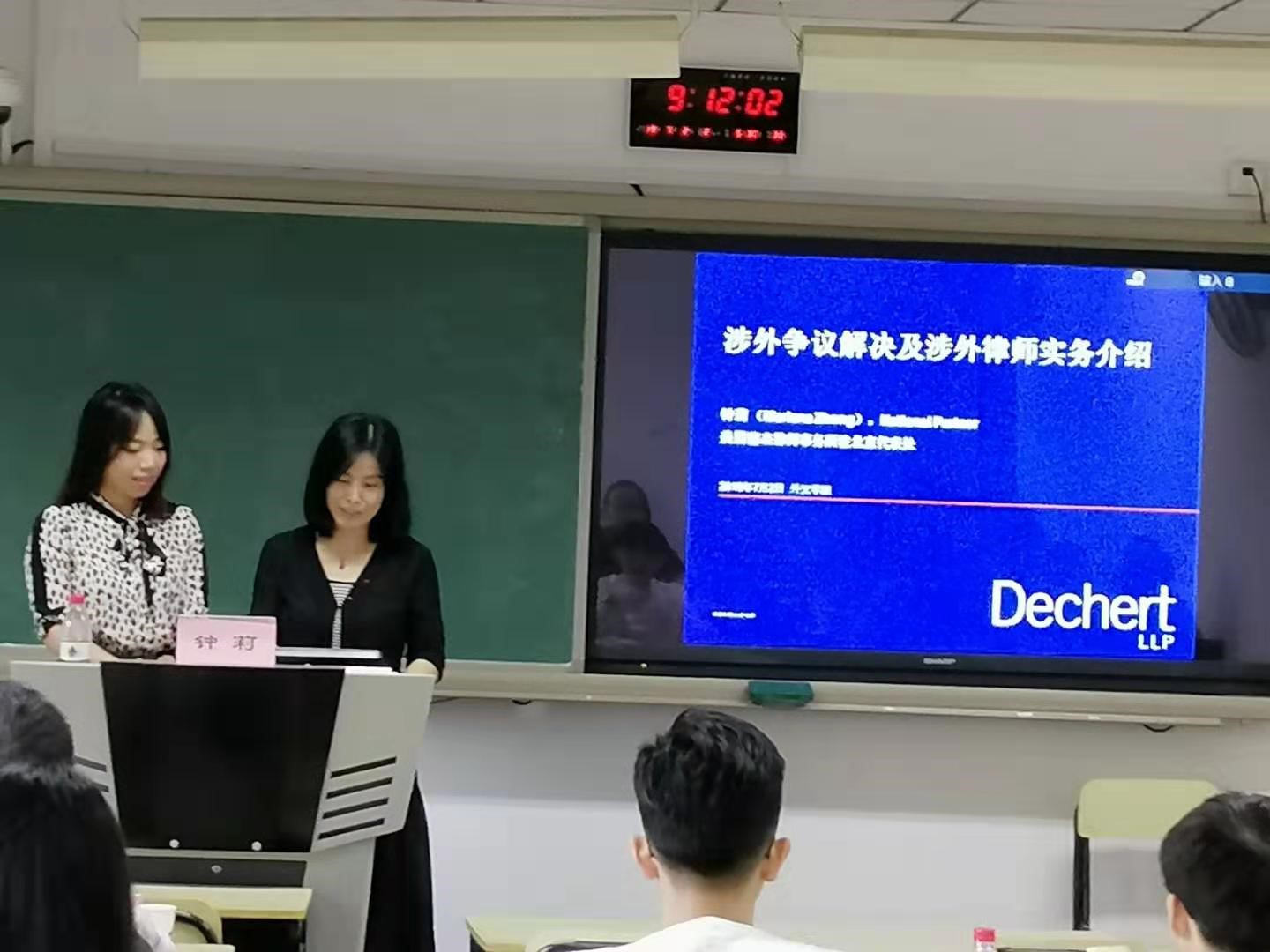 7月2日上午,来自美国德杰律师事务所驻北京代表处的我系优秀校友钟莉律师为同学们带来了主题为“涉外争议解决与法律事务”的专题讲座。