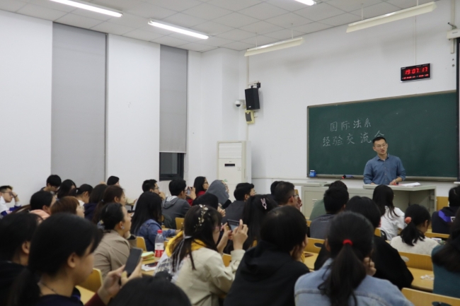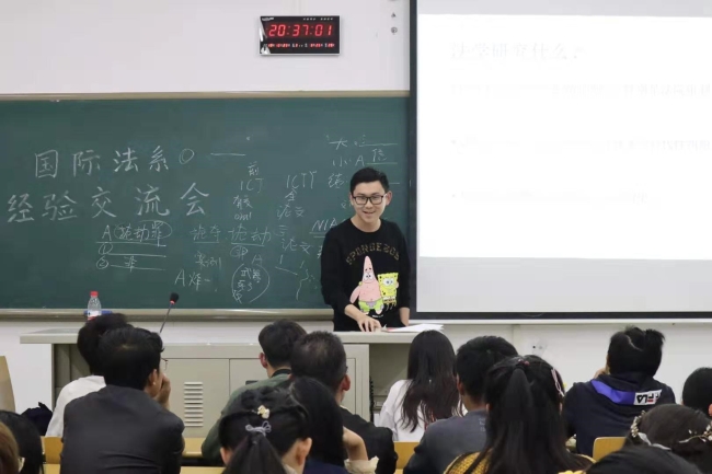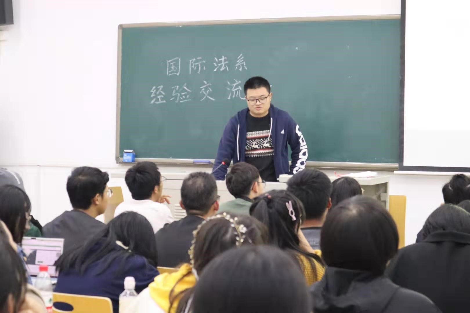 接着,董健宁同学向大家分享了模拟法庭信息检索和书状写作经验。他详细介绍了相关检索网站,带着大家初步浏览网站。并结合自身经历,分享模拟法庭书状写作经验。大家全神贯注地聆听他的讲解,仿佛打开了新世界的大门。 随后,余施语同学向大家分享了模拟法庭口头辩论环节的经验。她首先向大家介绍了国内外模拟法庭赛事的基本信息,加深了大家对模拟法庭这一国际法系传统赛事的认识。然后她结合自身丰富的模拟法庭参赛经历,为大家介绍了模拟法庭口头辩论环节的经验。大家听后纷纷跃跃欲试,表现出对模拟法庭的强烈兴趣。 最后,由林泽宇同学为大家详细介绍了法学论文写作的方法。他从法学的基本问题出发,从选题、综述、论证等几方面讲解论文的写作流程,强调了论文写作的小细节,最后提醒大家在学习上要敢于质疑与怀疑。林泽宇同学的一席话引起了大家的深思,相信会对大家将来的论文写作大有裨益。 在活动最后的提问环节中,同学们就自己的疑惑积极举手提问,四位同学进行了耐心细致的解答,氛围轻松热烈,为此次经验分享会划上了圆满的句号。 学习经验交流分享会为国际法系的同学们提供了一个加强交流、相互学习的平台,发扬了国际法系团结友爱的良好传统。通过学习经验交流分享会,同学们获得了满满的干货,逐渐拨开了大学学习的迷雾,能够更好地规划自身的发展。同时,大一大二的同学们通过此活动找到了学习的榜样,更会在之后的日子里努力提升自己,探索法学科的奥妙,并在今后同样热心地为学弟学妹传授经验、答疑解惑。