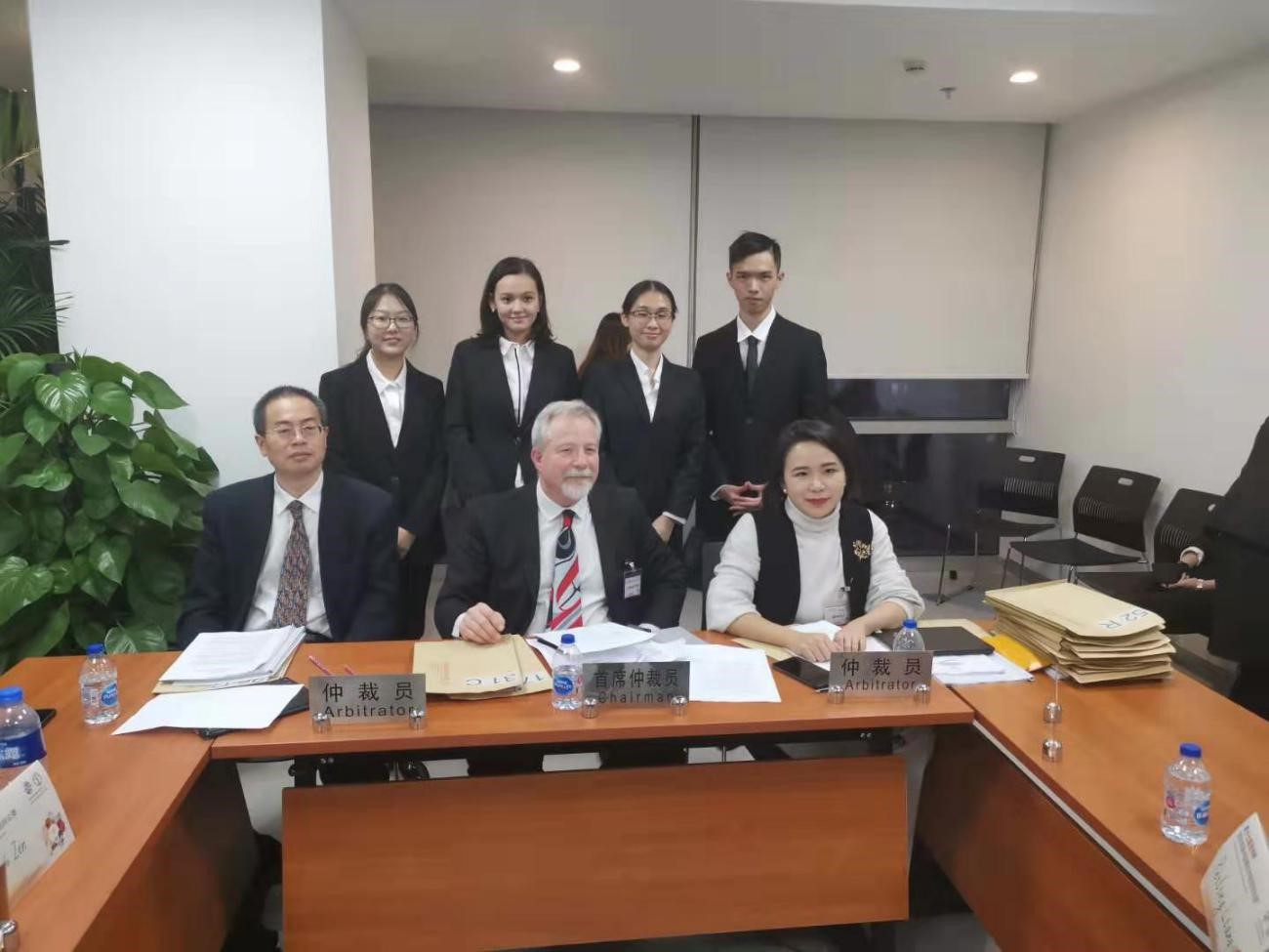 图为曾诗淇(后排左二)、尹童晖(后排左一)与仲裁庭合影