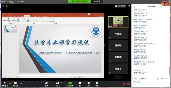 2015年起,我系连续四年举办了“人生与职业规划系列活动”,全方位、多层次、有针对性地帮助同学们解决大学学习、生活和职业选择中的困惑。在抗击疫情的特殊时期,系列活动因时而进,因势而新,经过充分调研,寻找学生学习过程中的关注点和难题。2020年3月21日下午,我系积极探索新的学习形式,依托zoom软件在线开展了2019-2020学年第三场活动——“法学专业课学习漫谈”沙龙。本次活动邀请了我系六位2017级优秀学生代表(林泽宇、严帅东、杨睿智、刘朝博、王姿月、余施语),向同学们分享专业课学习的心得体会。