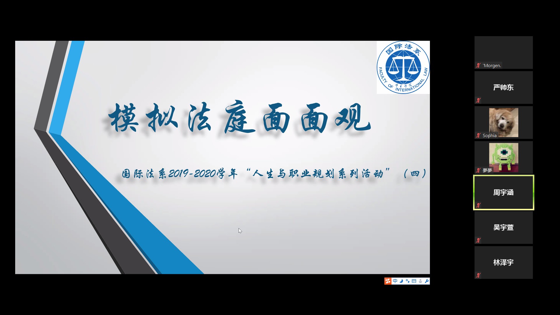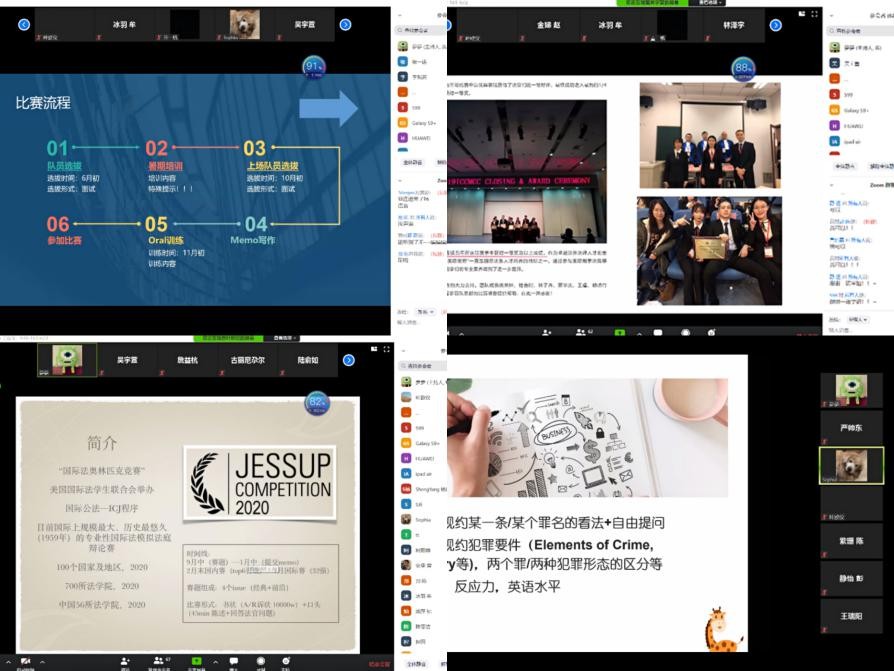 为了加强同学们对模拟法庭竞赛的了解,合理安排学习规划,2020年3月22日下午,在模拟法庭指导老师的推荐和支持下,我系邀请了参加过各大模拟法庭赛事的八位获奖同学代表(张一诺、吴宇萱、叶欧仪、王淑菲、王姿月、严帅东、林泽宇、王瑞阳),在线对各大赛事进行详细介绍。