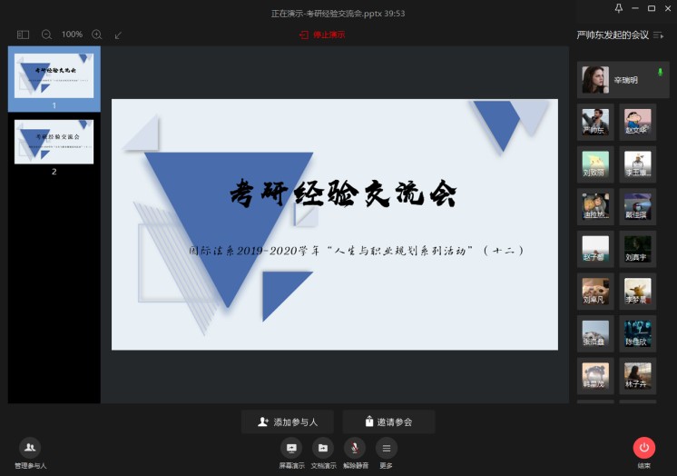 为了帮助同学们了解考研的相关情况,科学地进行大学生涯规划,2020年5月27日晚,我系在线举办了2019-2020学年“人生与职业规划系列活动”的第十二场——考研经验交流会。本次活动由辅导员谢梦老师主持,邀请了我系2016级刘致丽等八位同学,分享了备战研究生考试的相关经验。