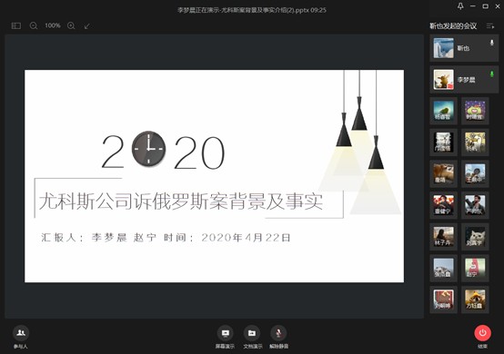 4月22日,实验班举办了线上“尤科斯公司与俄罗斯政府投资仲裁案”专题沙龙,本次活动由靳也老师主持。同学们阅读并分析了国际投资法经典案例“尤科斯案”的裁决与判决,对其观点进行了评价。