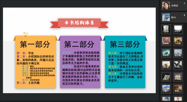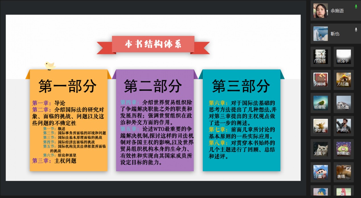 4月8日,实验班举办了线上Sovereignty, the WTO and Changing Fundamentals of International Law读书会,本次读书会由靳也老师主持。同学们首先对书中各章节的内容进行介绍并发表自己的观点,并针对“WTO上诉机构出现危机的原因是什么?如何看待特朗普政权下美国“反全球化”经济政策对国际经济法律规则的影响?”等问题进行了讨论。
