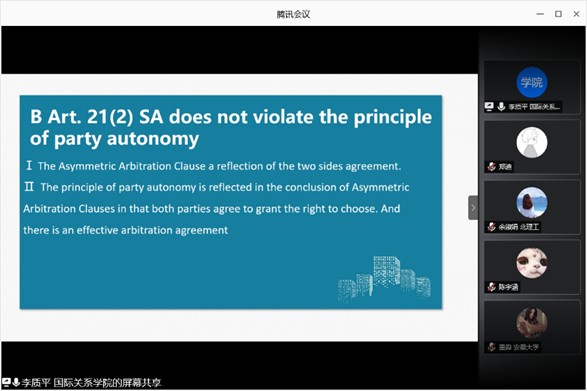 7月12日下午3时,我系张春燕老师及杨赟老师主持了国际私法与国际经济法案例研讨活动。本次案例研讨选取第十七届“贸仲杯”国际商事模拟仲裁庭辩论赛案例,聚焦国际私法经典案例和热点问题,以小组英文展示的形式进行,每组同学就本组分配的问题陈述争端产生的事实、诉讼过程、当事方的争议问题、规则及其解释、规则对事实的适用、结论以及对法院裁判的评价。本次研讨活动气氛热烈,六支团队配合默契,完美地完成了展示,同学们借此机会进一步掌握了分析案例的思路和实体、程序问题中的专业知识。