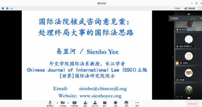 开班仪式结束后,我系易显河老师为同学们带来了主题为“国际法院核武咨询意见案:处理终局大事的国际法思路”的线上讲座。易老师从《国际法院规约》38条入手,带领大家深入分析1996年国际法院关于处理核武问题的报告。易老师还和同学们分享了自己多年来研习国际法的心得,鼓励同学们努力接触国际法理论的“边界”,并要为国际法的发展留下自己的“脚印”。随后,同学们针对在国际公法理论以及国际法学习方法等方面的困惑踊跃发言提问。