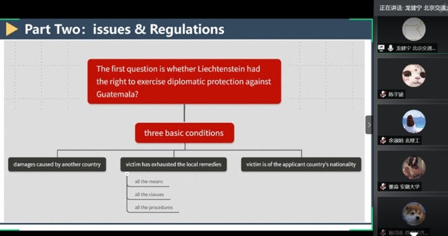 7月12日上午9时,我系宋岩老师主持了国际公法案例研讨。选取包括“United States Diplomatic and Consular Staff in Tehran (United States of America v. Iran)”和 “Gabčíkovo–Nagymaros Project (Hungary v. Slovakia)”在内的六组案例,聚焦国际公法经典案例和热点问题,具有实践意义和教学意义。研讨通过前期的案例布置、分组讨论到当天的小组展示,使同学们掌握了分析案例的思路和相关国际法规则,感受到实践学习的重要性。