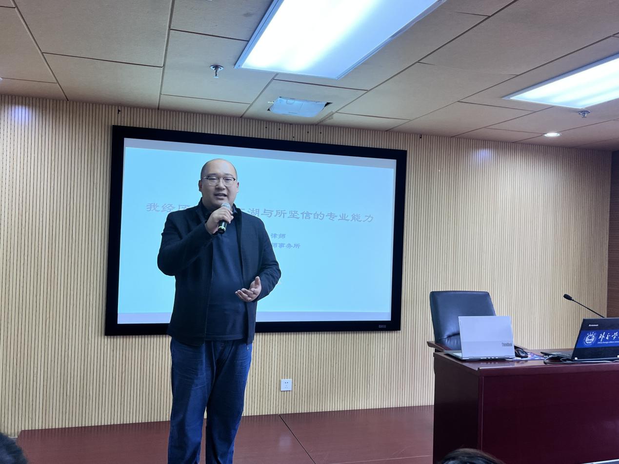 郝赟律师结合自身求学、职业生涯规划的经历,生动全面地介绍了律师职业和法律实务。围绕职业生涯的定位和规划、职业能力要求、职业价值观等方面展开了深入浅出的讲解,让同学们对律师这一职业有了充分的了解,客观真实地展示了律师职业的机遇与挑战,责任与担当。
