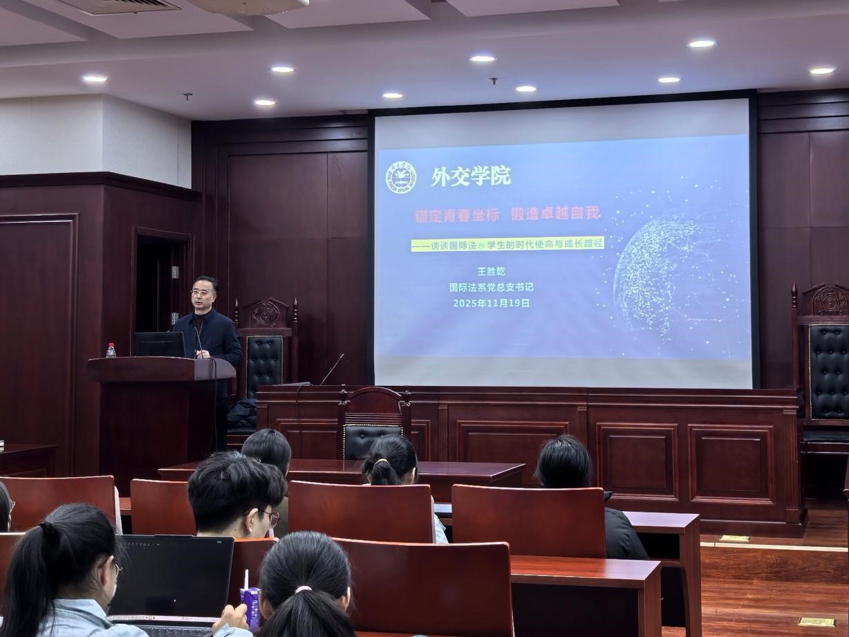 2025年11月19日,外交学院国际法系大一年级举办“锚定青春目标 锻造卓越自我——谈谈国际法系学生的时代使命与成长路径”专题党课,国际法系党总支书记王胜乾老师主讲,国际法系全体大一同学参与学习。本次活动作为国际法系新生引航教育系列活动与国际法系“人生与职业规划”系列活动之一,为同学们呈上了一场思想与成长的双重引领。