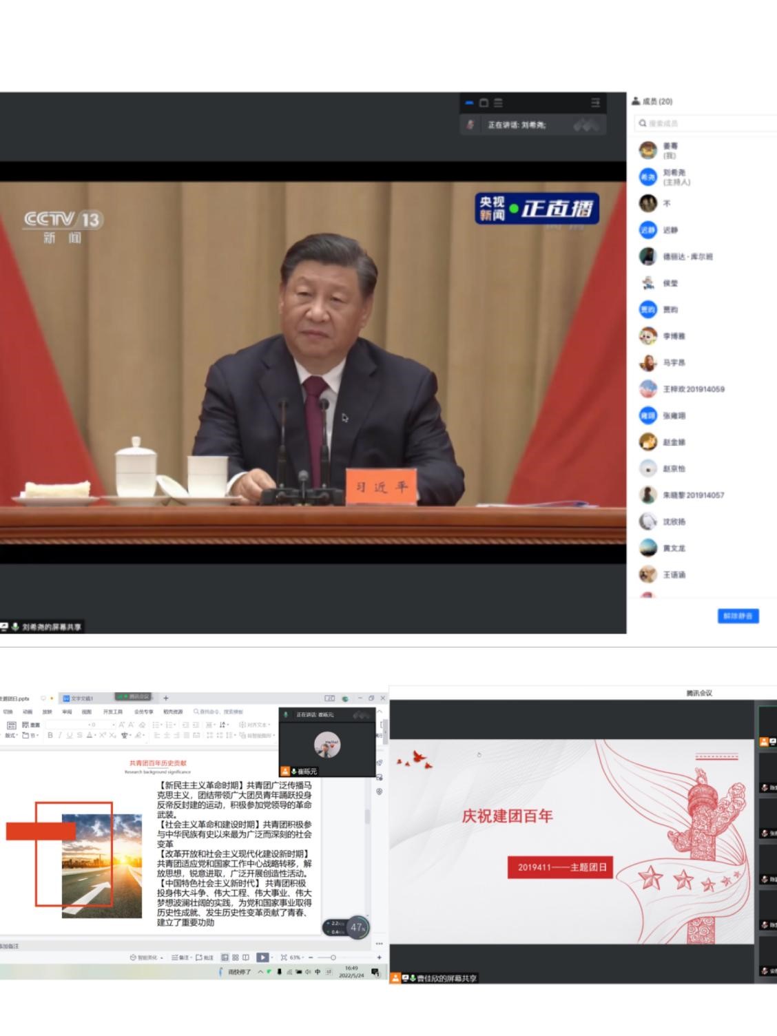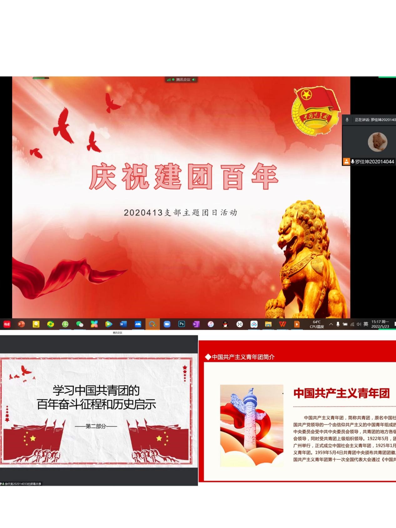 首先,全体团员集中学习了《中国共青团的百年奋斗征程和历史启示》,团员们一起学习了共青团的起源发展、基本任务、重要发展阶段、重要历史事件等。随后,同学们共同观看了习近平总书记在庆祝中国共产主义青年团成立100周年大会上的讲话视频。总书记指出,百年来,围绕不同的历史任务,一代一代团员青年奋力追梦,以青春之歌筑青春之国,并对当代青年提出了殷切的寄语和期望。接下来,同学们认真研读了大会庆祝目的、五四运动的意义、共青团的初心使命、共青团的百年历史贡献等重要内容。
