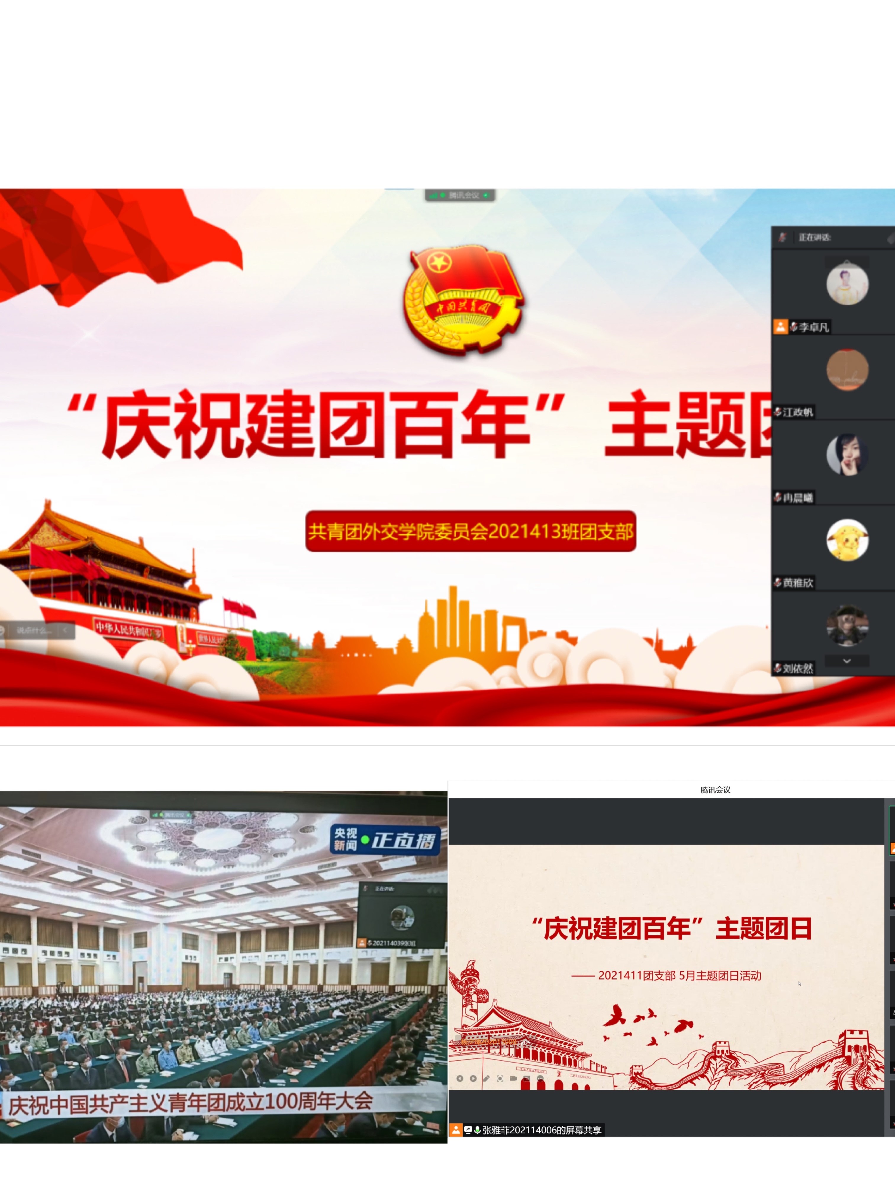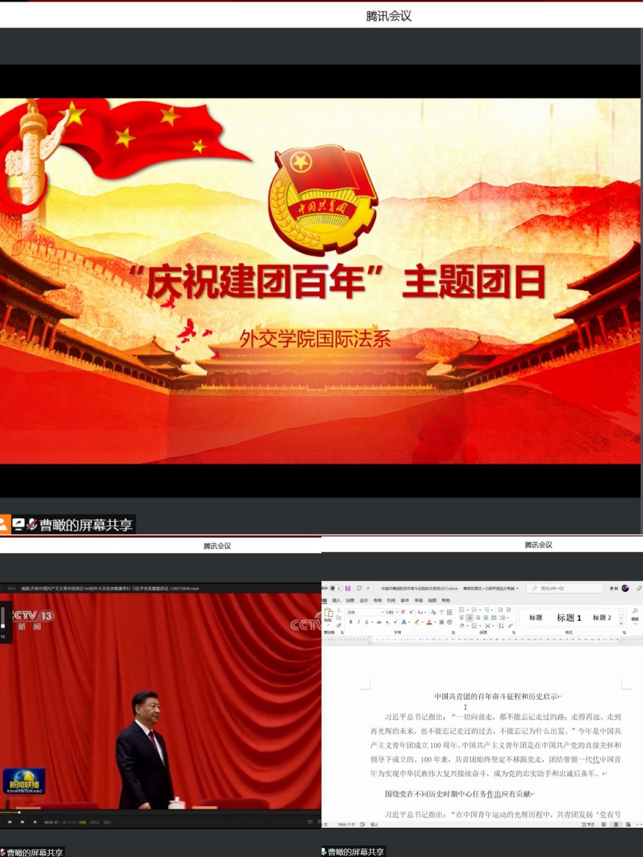 2022年5月10日上午,庆祝中国共产主义青年团成立100周年大会在北京人民大会堂隆重举行。中共中央总书记、国家主席、中央军委主席习近平在会上发表重要讲话强调,青春孕育无限希望,青年创造美好明天。为引领外交学院国际法系每一位青年学子深刻认识、认真领会、准确把握共青团百年奋斗精神,明确五四运动的重要意义,热烈庆祝共青团成立100周年,5月23日-5月26日,国际法系团总支12个团支部分别开展了“庆祝建团百年”主题团日,这也是我系“五月的花海”青年月系列活动第五场。