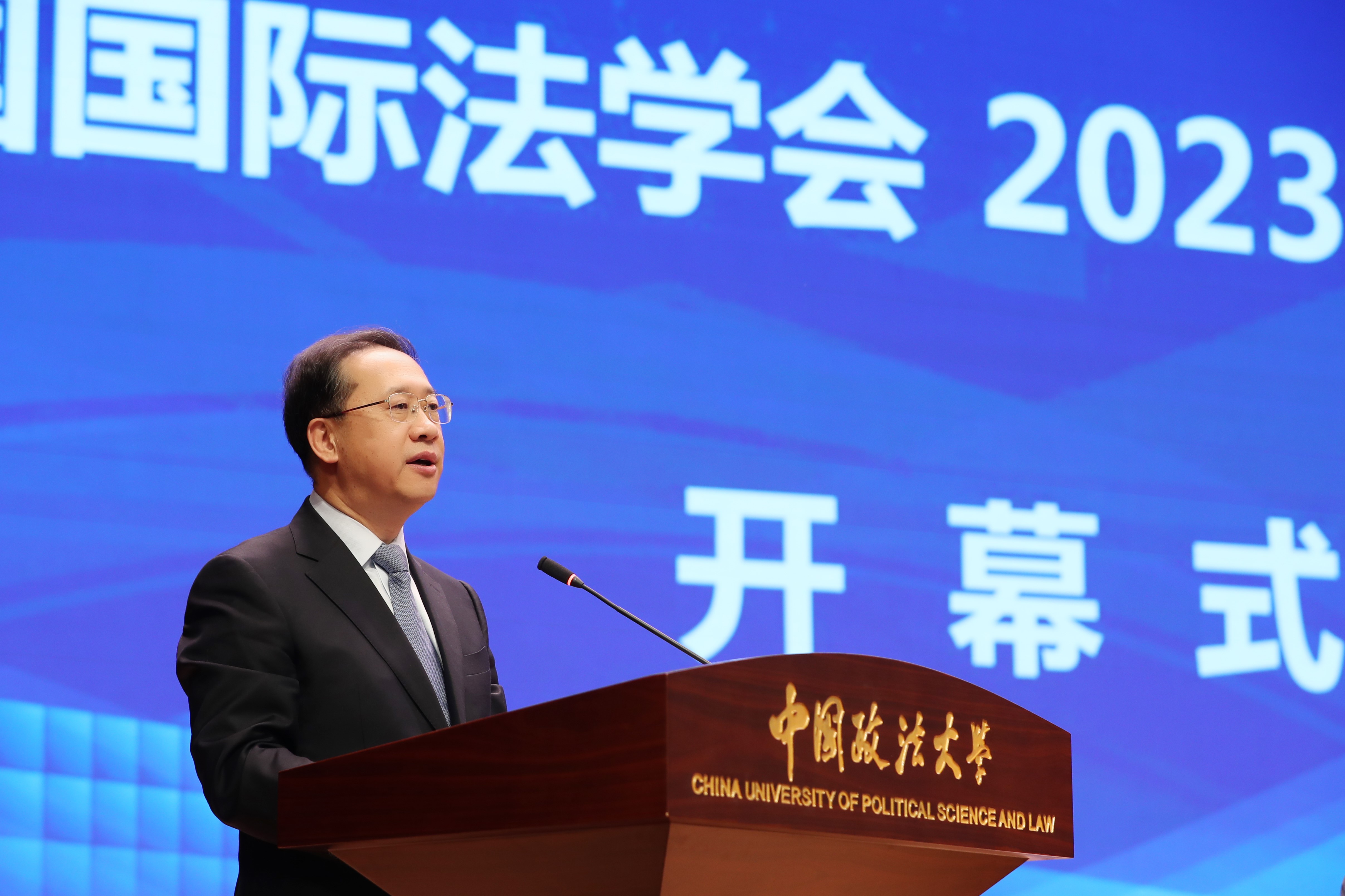 中国国际法学会2023年学术年会主题为“世界大变局下的国际法:守正与创新”。外交部副部长马朝旭出席开幕式并致辞。中国国际法学会原会长、第十三届全国人大常委会副委员长曹建明,中国国际法学会原会长、全国人大法制工作委员会原主任李适时,司法部副部长左力,最高人民法院审判委员会副部级专职委员王淑梅、中国国际法学会会长黄进、中国政法大学校长马怀德等出席。