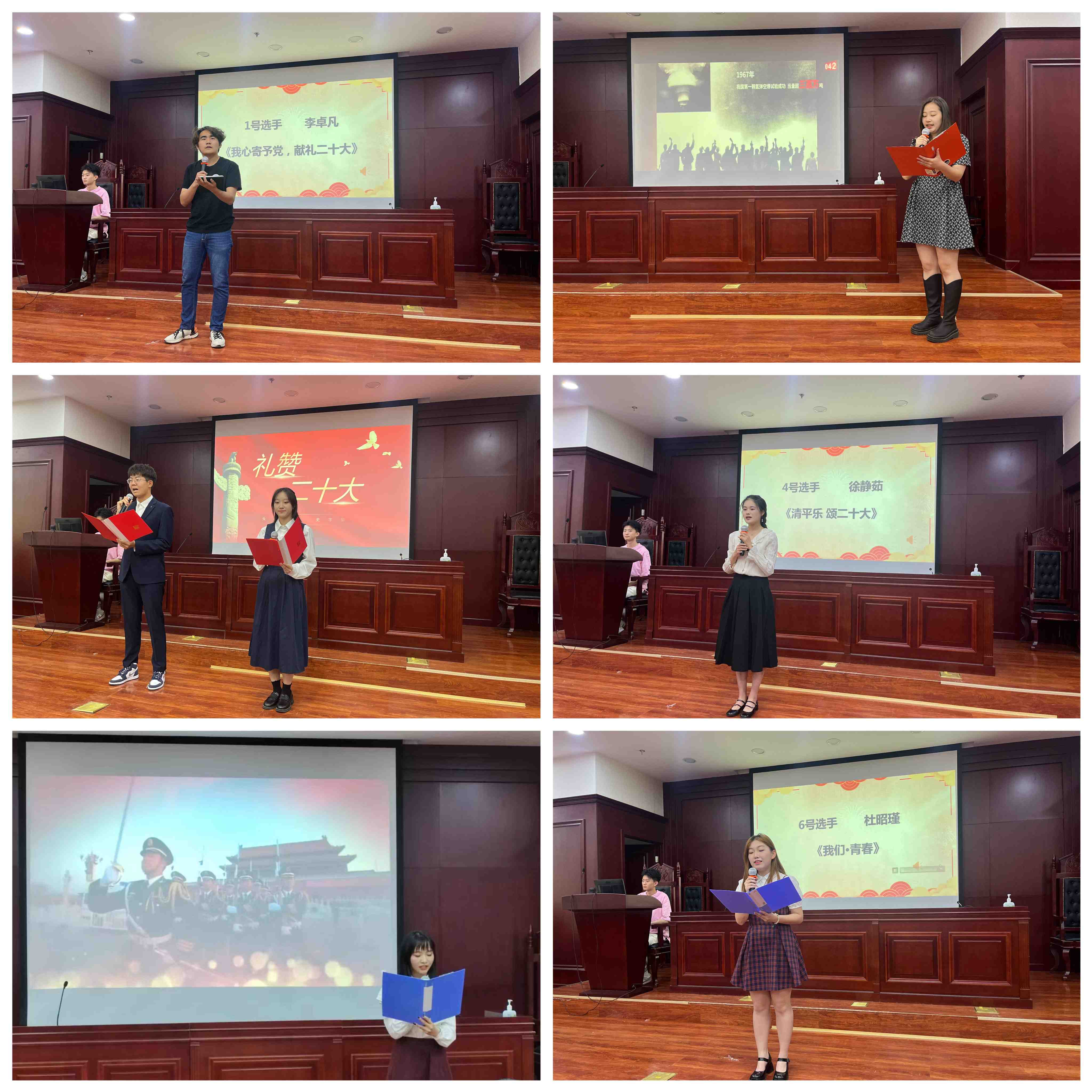 参赛选手结合二十大会议精神和党史学习教育的重要内容,开展了精彩的原创诗朗诵,充分展现了国法学生坚定信念跟党走的决心和朝气蓬勃的精神风貌。同学们仪表大方,举止从容,精神饱满,感情充沛。朗诵抑扬顿挫、声情并茂,使观众们的心情也随之澎湃。