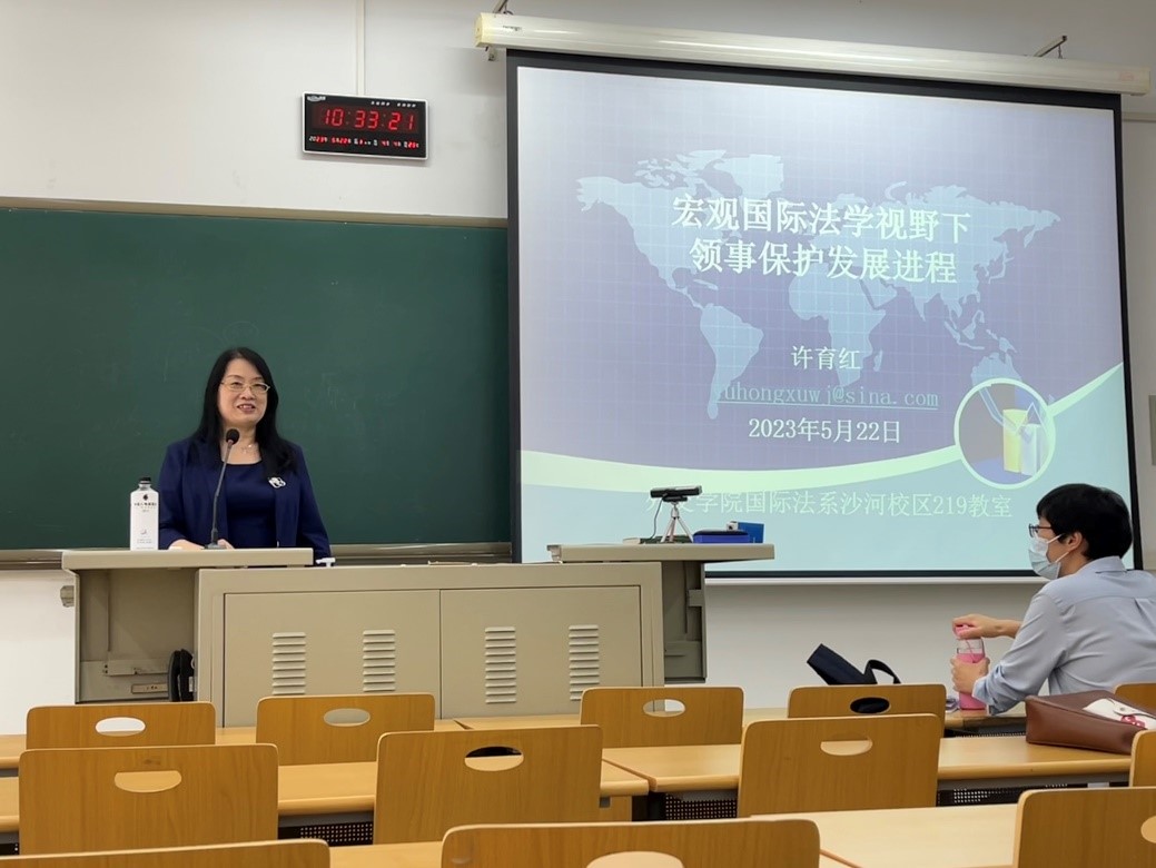 2023年5月22日上午,国际法系举办“宏观国际法学视野下领事保护发展进程”专题讲座,本次讲座由外交部领事司许育红博士主讲,国际法系王佳老师主持,宋岩老师协调,国际法系多名本科生及研究生参加。