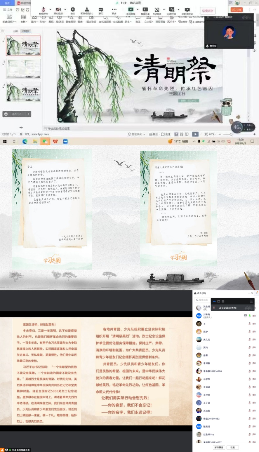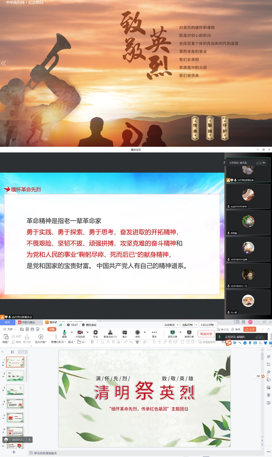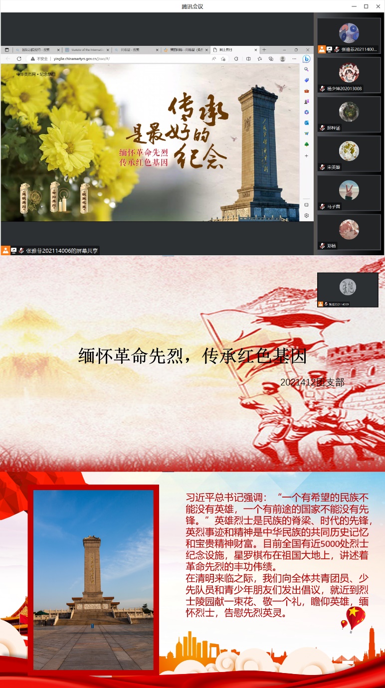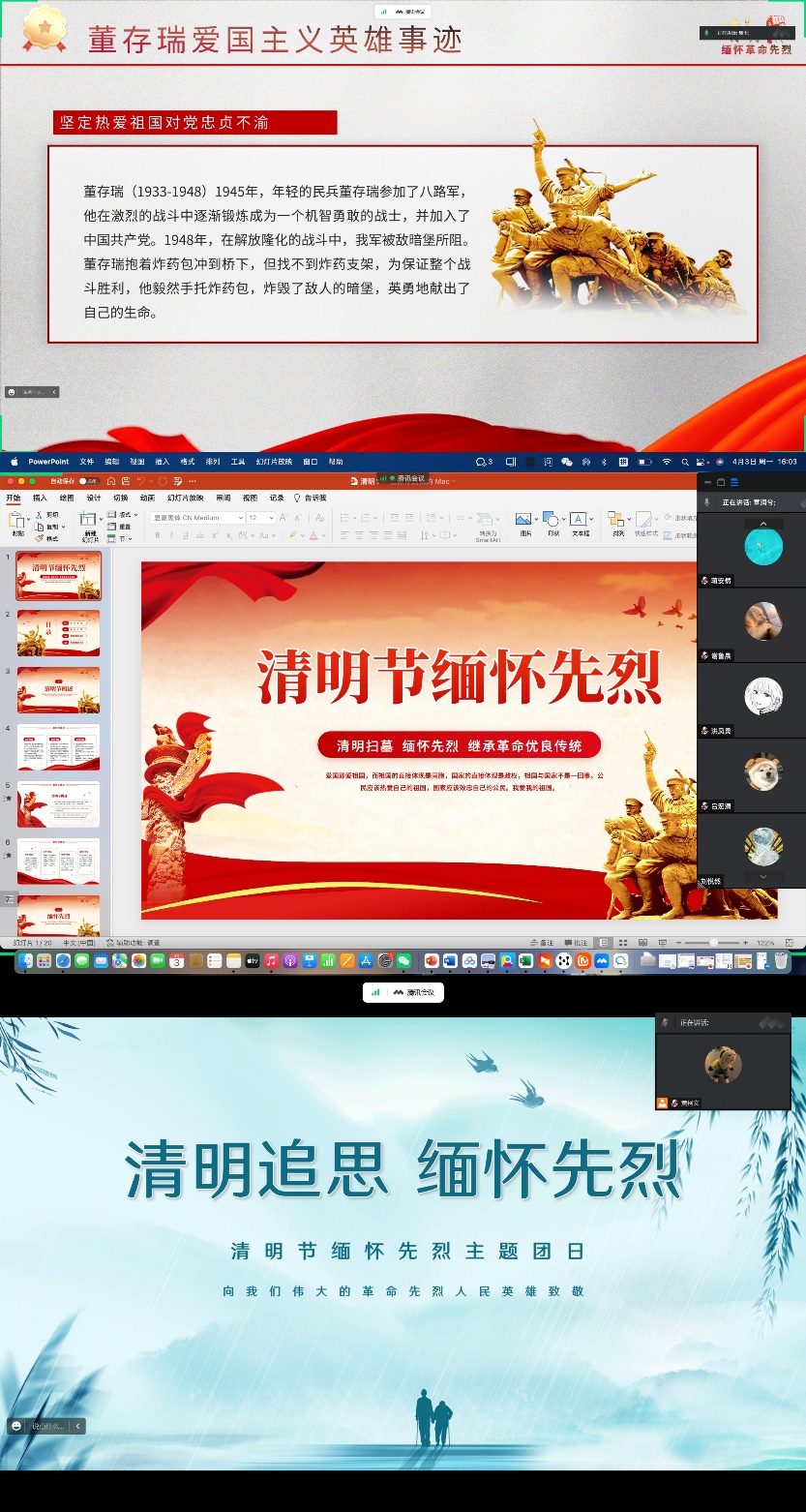 各团支部研读了《关于清明节纪念缅怀英雄烈士的倡议》,深入学习习近平总书记讲话精神,通过朗读刘伯坚、左权、向警予、陈觉等九位革命同志满怀大义与深情的红色家书,学习了他们的英勇革命事迹,真切感受到革命先烈一心为国、坚贞不屈的革命精神。最后,同学们怀着崇高的敬意进行线上祭扫活动,为英烈献花,写下对革命先烈的敬意与缅怀。同学们表示,一百多年来,有两千余万名英雄烈士为争取民族独立和人民解放,实现国家富强和人民幸福矢志奋斗、无私奉献、英勇牺牲,他们是中华民族最闪亮的坐标。英雄烈士是民族的脊梁、时代的先锋,英烈事迹和精神是中华民族的共同记忆和宝贵的精神财富。深切缅怀革命先烈的不朽功勋,可以激励广大青年学子继承革命光荣传统,弘扬烈士精神,汲取奋斗力量,不忘初心、牢记使命,为实现中华民族伟大复兴中国梦而不懈奋斗。