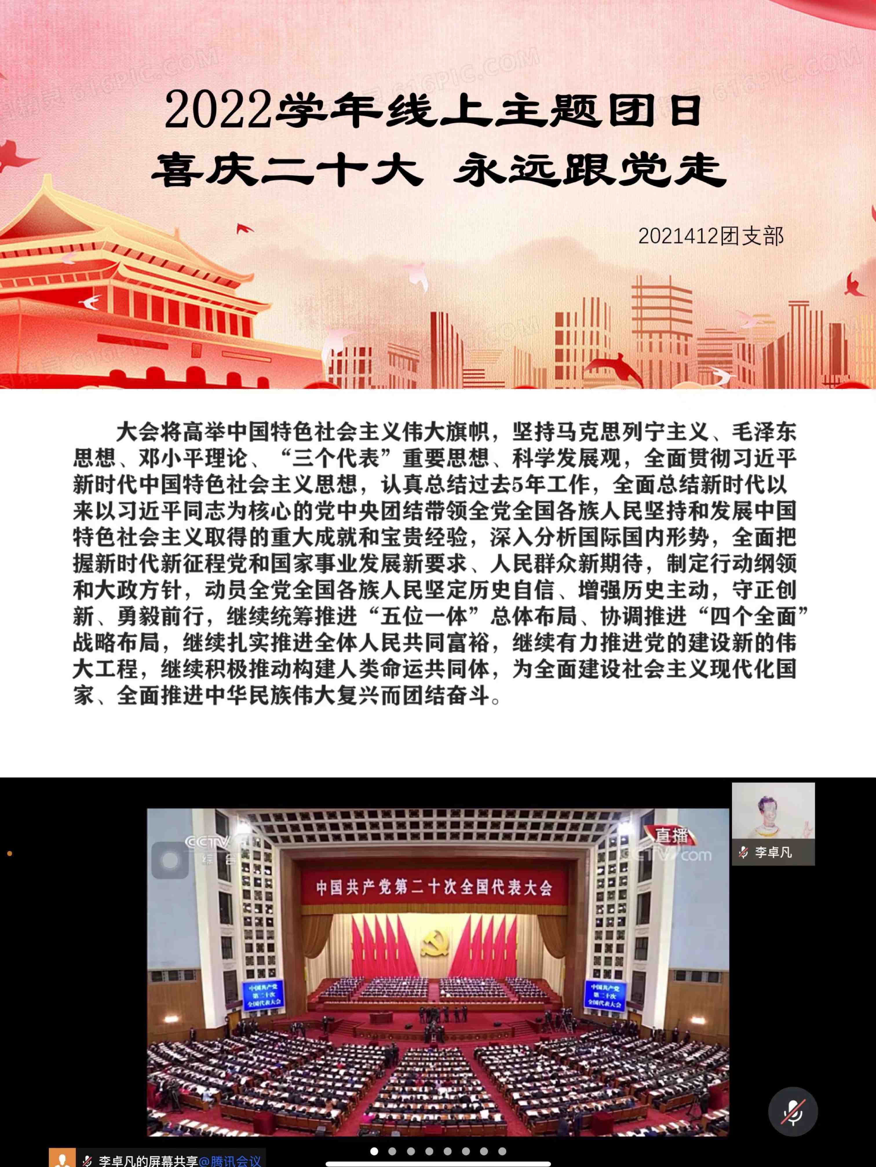 2022年10月16日10时,举世瞩目的中国共产党第二十次全国代表大会在人民大会堂隆重开幕,习近平总书记代表十九届中央委员会向大会作报告。为认真学习党的二十大精神,国际法系团总支于10月16日当天组织了12个团支部全体团员开展了以“喜庆二十大,永远跟党走”为主题的团日学习,利用网络平台,集中观看了中国共产党第二十次全国代表大会开幕会的实况转播,学习研讨并深刻领悟党和国家过去五年的伟大成就与新时代十年的伟大变革,进一步领会新时代外交学子肩负的使命和担当。