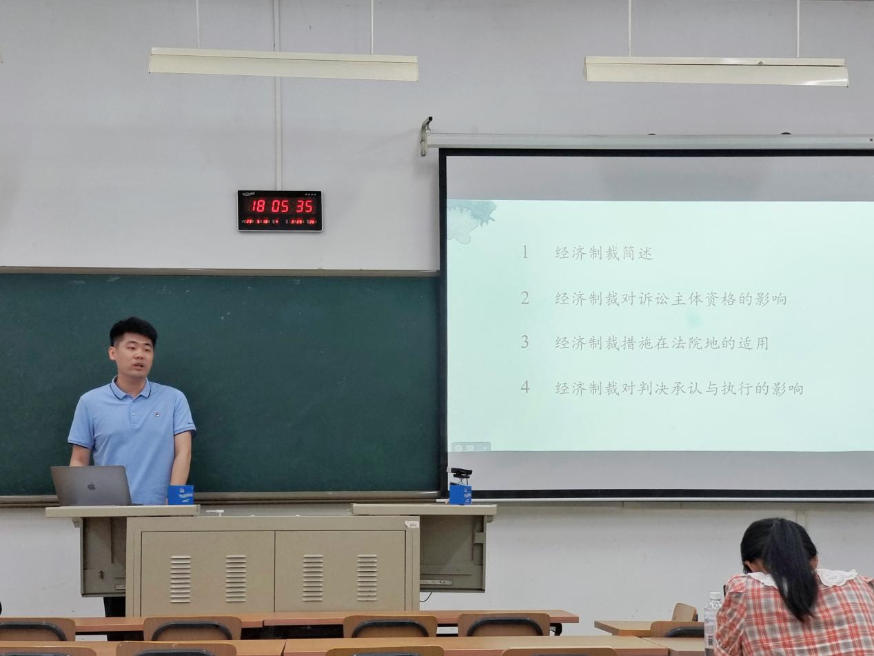 在本次学术沙龙中,陈南睿老师首先为同学们介绍了经济制裁的基础知识,包括经济制裁的类型、效力等内容,并结合此前实验班讲座的内容以承上启下。陈老师随后以具体案例为切入点,就经济制裁对诉讼主体资格的影响、经济制裁措施在法院地的适用以及经济制裁对判决承认和执行的影响等三方面内容展开分析。而后,同学们依次对上述问题发表了自己的看法,激烈的讨论体现了同学们不同学术思维的碰撞。最后,陈南睿老师总结了本次学术沙龙同学们的主要观点与问题,并提出了对同学们未来开展学术研究的展望。