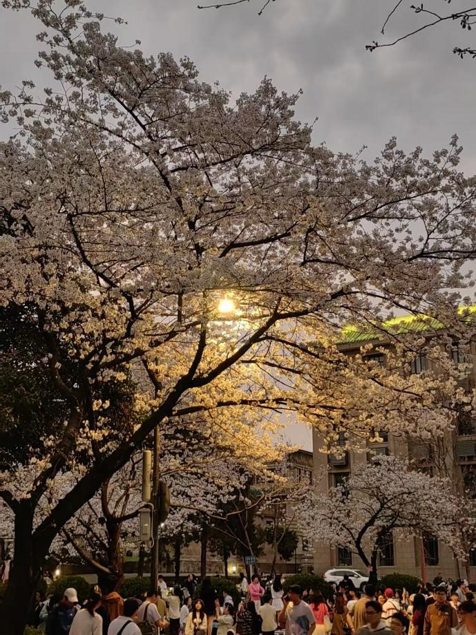 武大夜樱:夜色中的樱花长廊。书香与春意悄然相融。