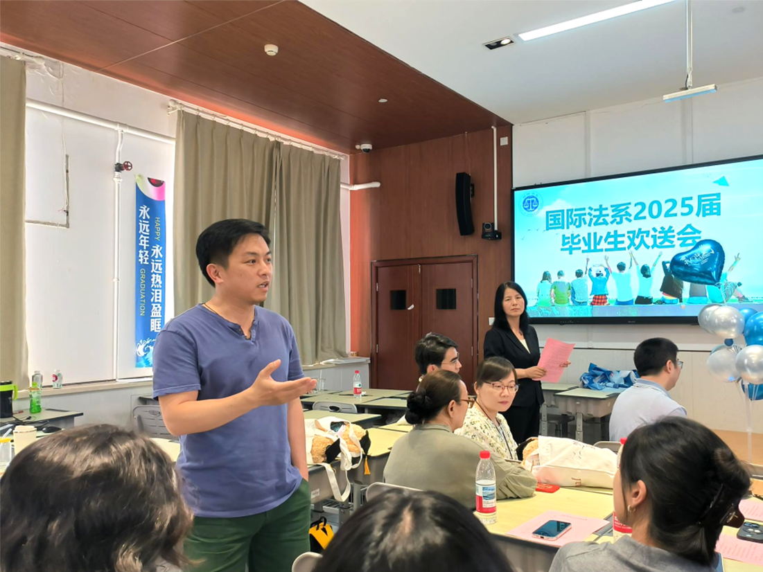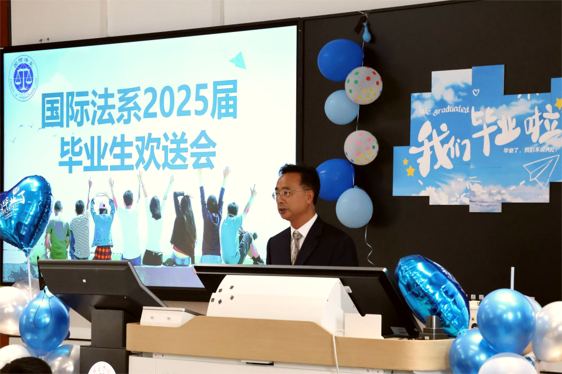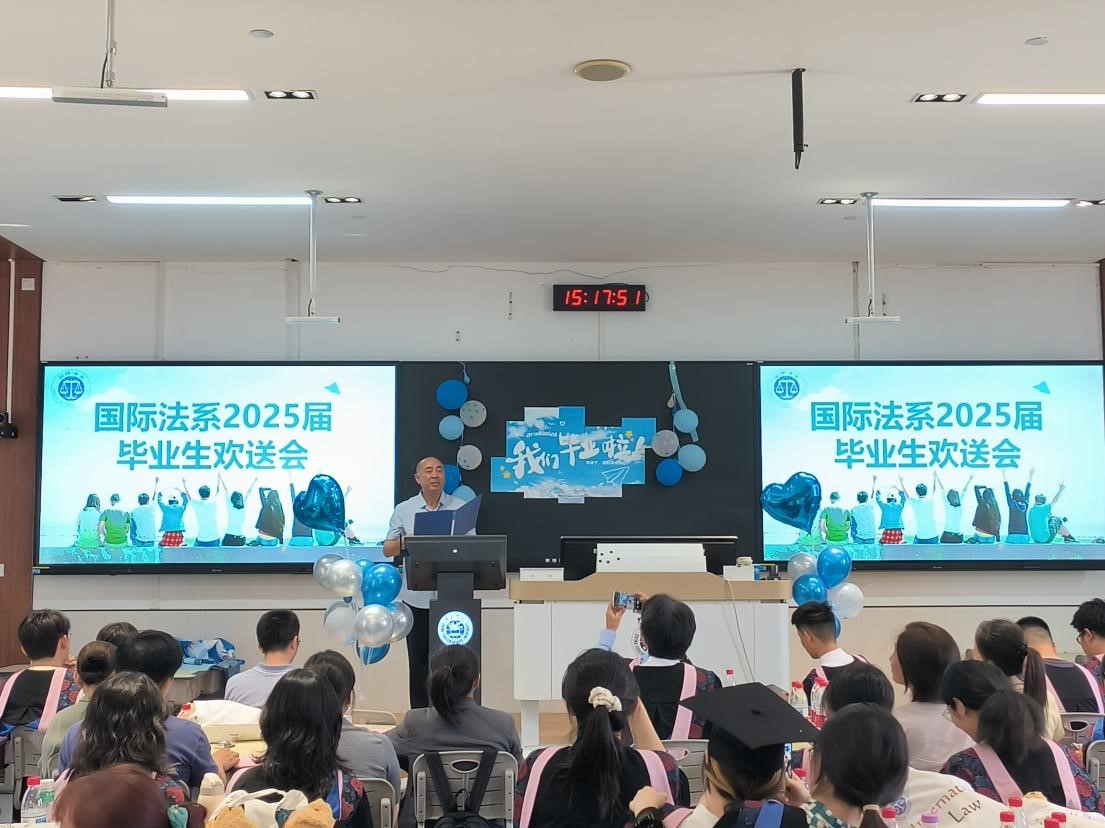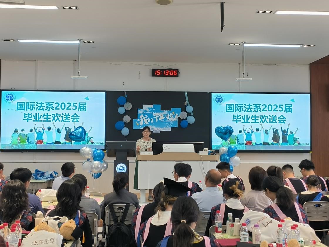 2025年6月25日下午,外交学院国际法系2025届毕业生欢送会在展览路校区423教室举行。国际法系教师代表焦阳老师、严文君老师、谢梦老师、杨赟老师、韩笑老师、郭欣彤老师、毕业生家长亲友们,以及2025届全体毕业生参加了本次欢送会。国际法系主任张华老师出席并致辞,系党总支书记王胜乾老师主持。