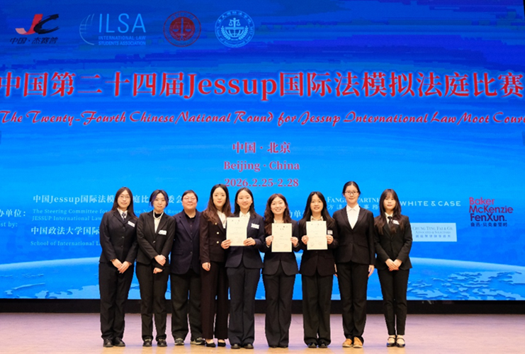 2026年中国第二十四届杰赛普国际法模拟法庭比赛于2月24日至2月28日举行。本次比赛吸引来自全国各地的68支法学院校代表队参加,竞争激烈。凭借优异表现,我院代表队荣获全国一等奖,杜昭瑾、蒋安然同学获最佳辩手,并成功晋级国际赛。