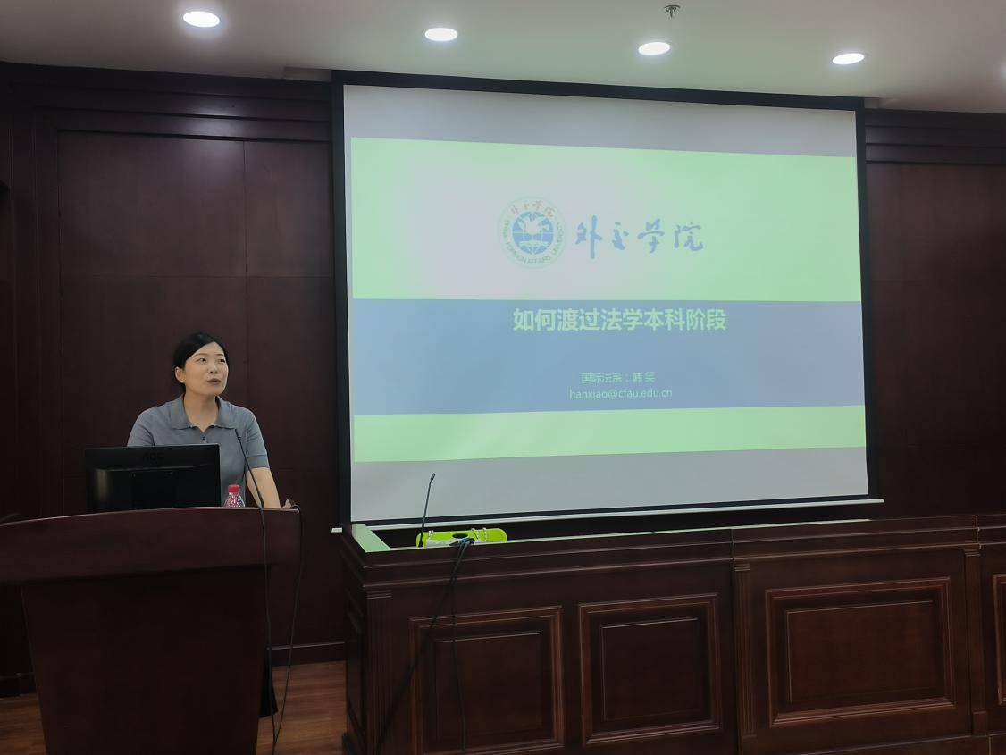 靳也老师以“国际法初探”为题,普及国际法知识,从基础概念切入说明其与国内法的区别,介绍我系国际法扎实的师资班底,彰显专业特色优势,最后分享国际法学习方法并鼓励新生提前了解课程。